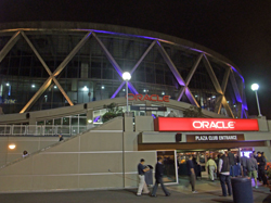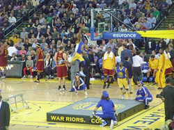 試合はNo.30 Stephen Curryの3点シュートの連発などもあって、第1クォーター(ピリオド・・・以下同じ)終了時点でWarriors 37 vs. Cavaliers 21、第2クォーター終了(ハーフタイム)時点でWarriors 59 vs. Cavaliers 51と比較的大きなリードで進みましたが、第3クォーター開始後に同点に追い付かれ、さらに1ゴール程度の逆転を許しました。しかし、その後に再逆転し、第3クォーター終了後時点でWarriors 85 vs. Cavaliers 74、Final Score:Warriors 106 vs. Cavaliers 96で見事に地元での勝利を飾りました(センタービジョンには抱き合って喜ぶ監督とコーチ?の姿が・・・)。