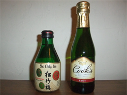 左はもちろん日本酒(ただし米国製)の松竹梅(Sho Chiku Bai)180ml (6.1 FL. OZ.=1合)です($4.69+Tax別)。これまた日本酒は元々がFL. OZ.単位ではないので中途半端な量として扱われます。