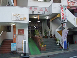 傾斜地に建てられているため脇に植木の並んだ階段を上がったやや高くなった1階が銭湯になっており(バリアフリーのスロープもあります)、1階の左右(というか中2階)は貸店舗、上階は賃貸物件(住宅)になっています。道なりに後ろに回ると3面に「