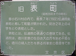 建物正面にはこんな説明板も大切に掲示されています(先代の建物にあったものでしょう)。昭和39年までの旧町名は表町で、伝通院(徳川家康の生母お大の方を始めとした千姫などの徳川家の婦人たちを葬った同家菩提寺)の表通りに由来するそうです。