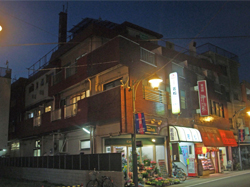 煉瓦風の外壁で入口は奥まっており、向かって左に花屋、右脇に2階の美容室への階段、さらに焼き鳥&うなぎ屋を挟んでコインランドリー(入口奥にもう1カ所あります)という配置になっています(温泉マークと屋号入りの四角柱煙突があります)。