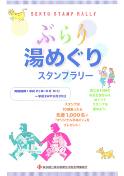 詳しくはここをご覧下さい。 http://1010.or.jp/event/ohenro/map.php 平成23年10月10日(銭湯の日)から平成24年9月30日までに、東京都浴場組合加盟の約770軒(現時点で766軒-2軒=764軒!)のうちの異なる10軒のお風呂屋さんを巡ってスタンプを集めて東京都浴場組合に郵送すると、達成印を捺印の上で返却されるとともに、先着1000名に記念品として「新宿区落合の松の湯(新宿5 上落合3-9-10)のご主人・笠原五夫氏が描いた銭湯のイラスト入りオリジナル手拭い」がプレゼントされます。 みなさま奮ってご参加ください。 なお、通常の銭湯お遍路も同時に進められます。 PR |