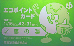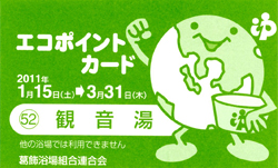 各銭湯でエコポイントカードを入手し、30ポイント集めると(入浴1回で1ポイント)、無料入浴1回プレゼントとのことです。
