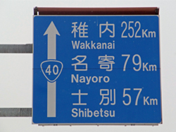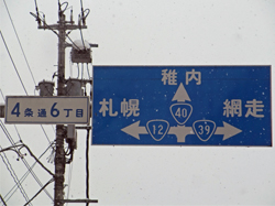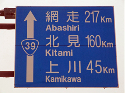 引き続きもう1つ、帰省先の北海道で仕込んできた銭湯とは無関係な「姑息な?」ネタです。 北海道の道路案内標識は他の都府県とは桁が違います。 旭川駅から程近い交差点(4条6丁目)にあるものですが、このあまりにもアバウトな標識に北海道の雄大さを感じていただけますでしょうか。 左折すると札幌まで136km。 右折すると北見まで160kmで網走まで217km。 直進すると何と稚内まで252kmもあるんです。 同一都道府県内にもかかわらずこの距離! 他の都府県の方が北海道にお越しの際は距離感覚の違いに十分ご注意ください。 因みに、運転免許証の更新時講習に使われる北海道公安委員会作成の補助テキストには、「北海道は九州+四国+岩手県+宮城県に匹敵する広さ」、「交通事故件数当たりの死亡率は他都府県の3倍&人身事故件数当たりの死亡率は他都府県の2倍(衝突すると一巻の終わり!?)」、「事故のパターンが欧米型(高速度での正面衝突や単独の路外転落などが多い/季節変動が顕著)」などと書かれています。 注)これは道内最長の距離標識ではありません(少なくともオホーツク海沿いの愚妻の実家付近に網走まで260kmあまりのものがありました)。道内及び道外の一般道路の案内標識で最長距離のものをご存じの方はお教えください。