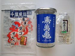 写真は帰りの列車での酒(寿萬亀-鴨川市 亀田酒造)とつまみ(タコせんべい2枚-鴨川市 亀屋&焼あさり2串-市原市 諏訪商店)です。