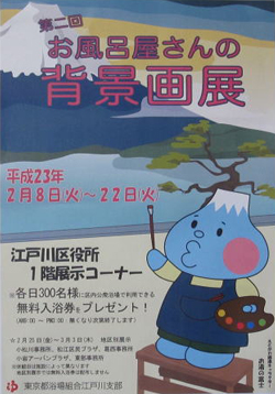 既に日付が変わりましたが、昨日、仕事を早めに切り上げて行ってみました。 江戸川区内にある52軒の全銭湯の背景画(あるいはタイル絵など)の写真が一堂に展示されています(今や昔の写真になってしまったものもあります)。 写真で見る限り、ペンキ絵は24軒、モザイクタイル絵は10軒にあるようです。 基本的に男が目にすることはない、故早川利光氏による「女湯のあまりにもポップなペンキ絵(2軒)」は必見・・・でしょうか。 ・中島盛夫氏&田中みずき氏による「銭湯背景画ができるまで 平成22年4月29日 於:仁岸湯(中央2-7-2)」のDVD上映(6分30秒) ・中島盛夫氏と丸山清人氏の略歴など ・山積みの黄色のケロリンの湯桶とその由来 ・レトロな体重計(稲荷湯) ・籐製の籠とタオル …なども展示されています。 江戸川区浴場組合による「Let's go 1010!!」という曲が流されています。 江戸川区商工勤労係発行の「江戸川区銭湯マップ」も配布されています。 夕方の訪問だったので「残念!」でしたが(私のような銭湯愛好家よりも普段は行かない一般の方々が受け取られた方が銭湯にとって良いとも言える)、毎日先着300名に江戸川区内で使える記念無料入浴券も配布されています。 平成23年2月25日(金)~3月3日(木)は、小松川事務所、松江区民プラザ、葛西事務所、小岩アーバンプラザ、東部事務所に移動します(休館日は各施設によって異なります)。 詳しくは↓ 江戸川区浴場組合HP http://www.1010.or.jp/~edogawa/index.html 江戸川区役所 商店街ワールド 「第2回お風呂屋さんの背景画展」開催 http://www.city.edogawa.tokyo.jp/nogyo_kogyo_shogyo/shoten/haikeiga/index.html 是非、行くべし! |